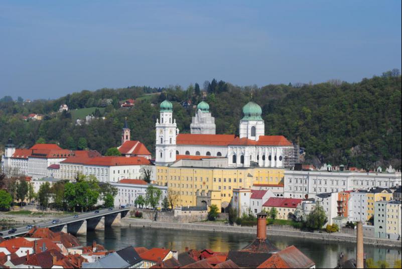 Die niederbayrische Stadt liegt an der Grenze zu Österreich und zeichnet sich durch ihre Funktion als "Dreiflüssestadt" aus. Den Namen trägt Passau aufgrund des Zusammenflusses der Flüsse Inn, Ilz und auch der Donau. An der Veste Niederhaus kommt es zu einem einzigartigen Schauspiel beim Zusammenfluss: Zunächst fließt die Ilz mit Ihrem schwarzen Wasser (fließt zuvor durch ein Moorgebiet) in die blaue Donau und daraufhin folgt die Inn mit dem grünen Alpenwasser. Somit hat die Donau für kurze Zeit dreifarbiges Wasser, welches sich allerdings zusehends vermischt und zum sprichwörtlichen "Blau der Donau" wird.