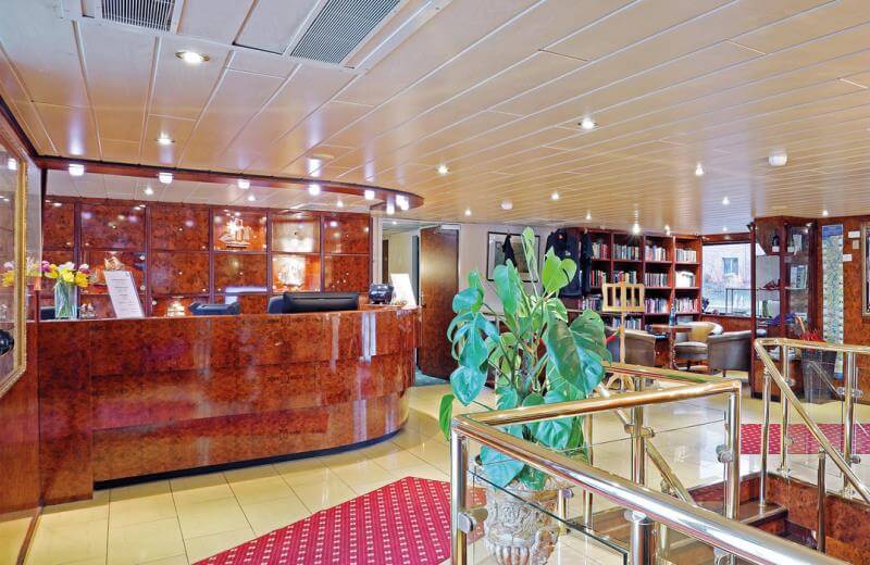 Treten Sie ein in das elegante Foyer der Sans Souci, das mit einer einladenden Lobby, einer Rezeption und einer gemütlichen Bord-Bibliothek aufwartet. Hier können Sie sich entspannen und in den vielfältigen Büchern schmökern, während Sie die Reise genießen. Die Panorama-Lounge ist rundum verglast und bietet einen herrlichen Ausblick auf die vorbeiziehende Landschaft. Lassen Sie sich von der Schönheit der Flusslandschaften verzaubern, während Sie in dieser einladenden Lounge entspannen.