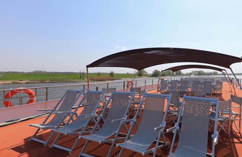 Das Sonnendeck mit Sonnensegel lädt zum Verweilen ein. Genießen Sie die frische Luft und den Panoramablick, während Sie sich entspannen. Dank eines Fahrstuhls ist das Eems-Deck für Gäste mit eingeschränkter Mobilität zugänglich. Ein Treppenlift führt Sie zum Sonnendeck, damit auch Sie die wunderbare Aussicht genießen können.