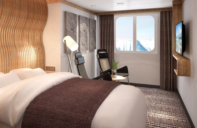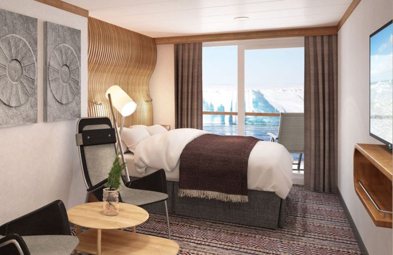 Suite mit privatem Balkon. Vordere Eck-Suite mit großen Fenstern, Doppelbett, das auf Wunsch in zwei Einzelbetten geändert werden kann, Du/WC, Badewanne, Bettsofa, TV, Minibar, Pflegeset, Bademantel, Wasserkocher, Tee und Kaffee, Espressomaschine.
