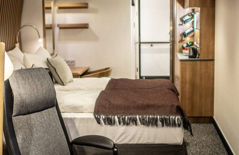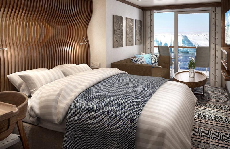 Suite mit privatem Balkon, Doppelbett, das auf Wunsch in zwei Einzelbetten geändert werden kann, Bettsofa, Du/WC, TV, Minibar, Pflegeset, Bademantel, Wasserkocher, Espressomaschine. Rollstuhlgerecht.