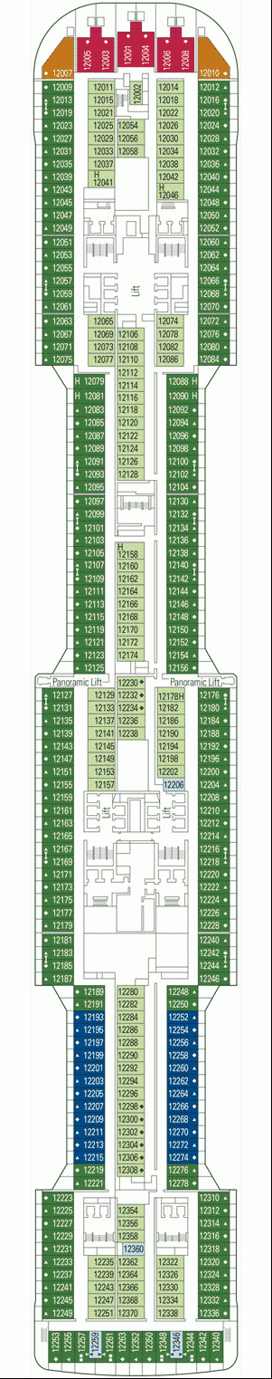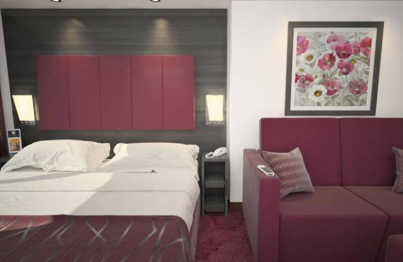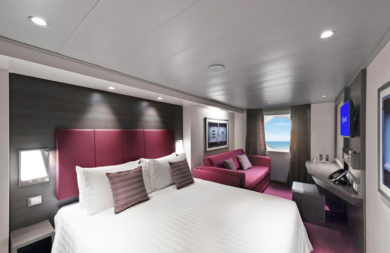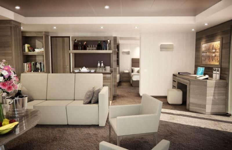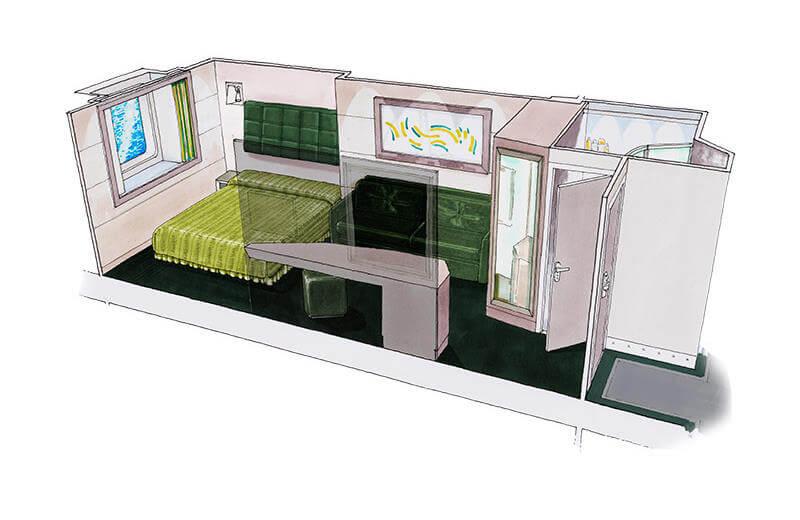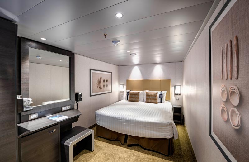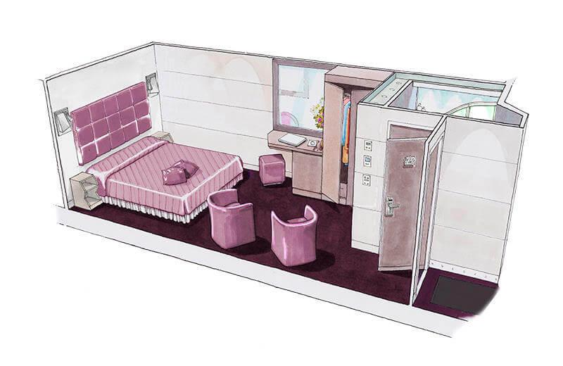 Diese neuen Innenkabinen sind komfortabel und edel eingerichtet und verfügen über ein Doppelbett (auf Wunsch als Einzelbetten verfügbar), ein Badezimmer mit Dusche und einen geräumige Kleiderschrank. Zudem befinden sich ein interaktiver TV, WLAN/WiFi (gegen Gebühr), Minibar, Telefon, Nespresso Kaffeemaschine, Klimaanlage und Safe in der Kabine.