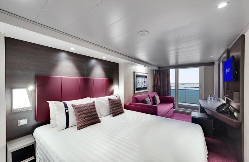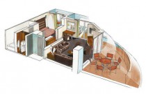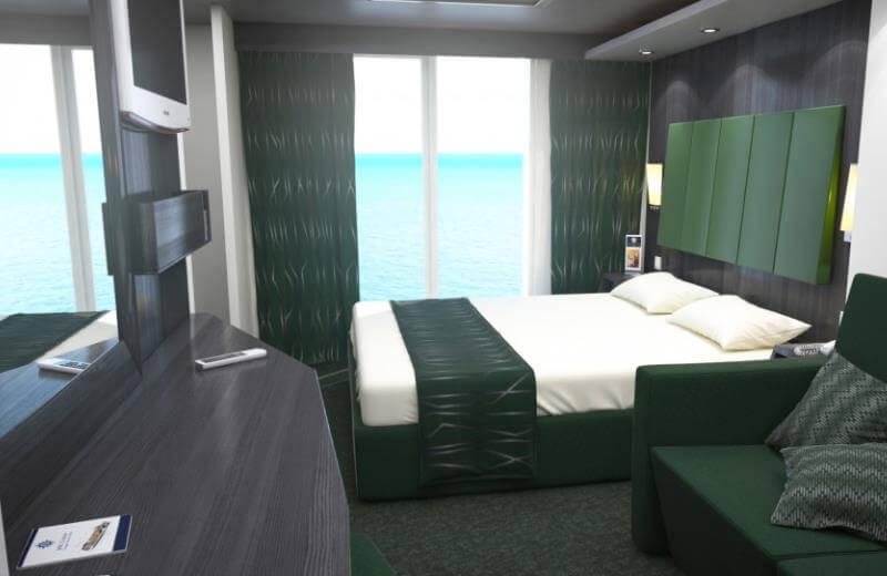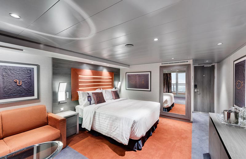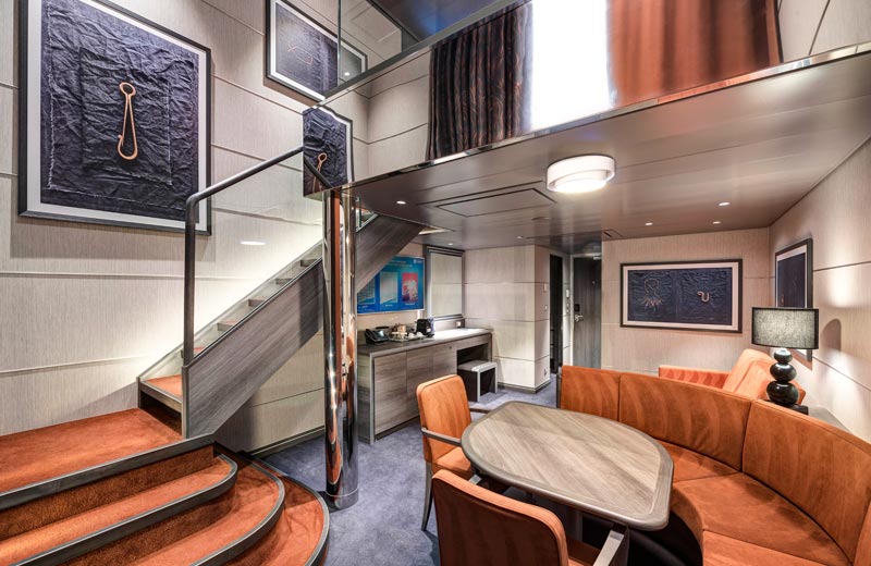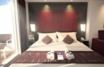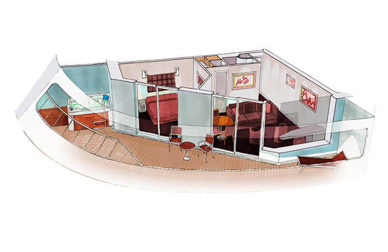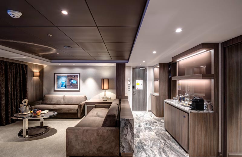 Die Yacht Club Deluxe Suiten sind edel und stilsicher eingerichtet und verfügen über ein Doppelbett, welches sich zu zwei Einzelbetten umwandeln lässt. Des Weiteren ist die Kabine mit interaktivem TV, geräumigem Kleiderschrank, Safe, Minibar, Wii Konsole, Telefon und Radio versehen. Das Badezimmer verfügt über eine hochwertige Marmorausstatung mit Badewanne sowie WC.