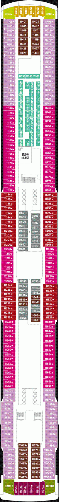 Die Studios sind speziell auf Alleinreisende zugeschnitten. Die Kabinen liegen in der Nähe der Studio Lounge in einem Bereich den man nur mit entsprechender Schlüsselkarte betreten kann. Die Kabinen verfügen über ein Fenster zum Korridor welches von Aussen nicht einsehbar ist. Zur Austattung gehören ein grosses Bett und ein Badezimmer mit separaten Badelementen. Jede Kabine ist mit Fernseher, Safe und individuell regulierbarer Klimaanlage ausgestattet.
