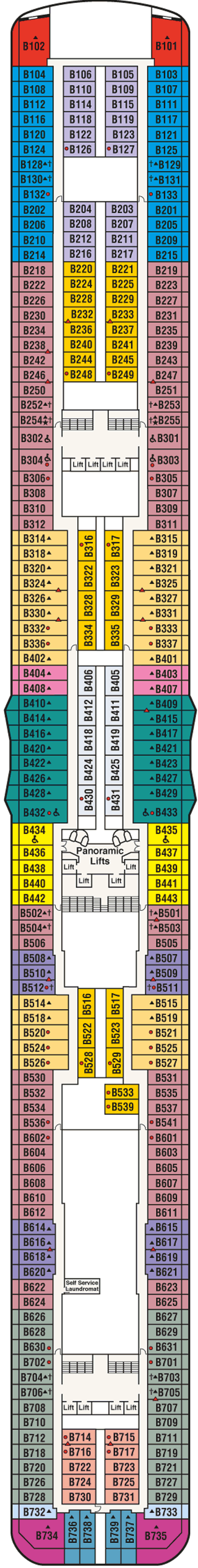 Diese mittschiffs gelegenen Balkonkabinen verfügen über zwei Einzelbetten, die sich in ein Queen-Size-Bett umwandeln lassen. Sie sind teilweise rollstuhlgerecht eingerichtet. Sie sind ausgestattet mit TV, Kühlschrank und Schreibtisch. Das Bad hat Dusche/WV. Diese Kabine kann durch eine Verbindungstür mit einer anderen kombiniert werden.