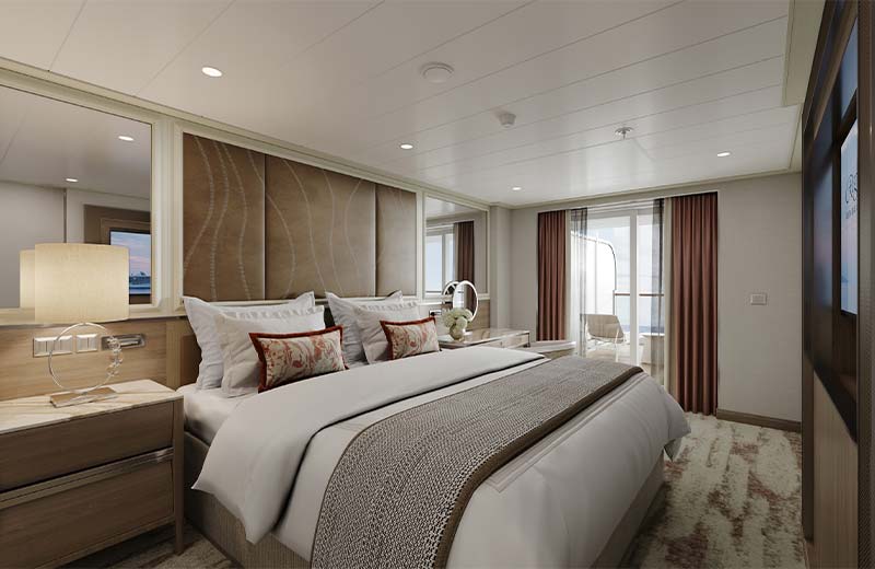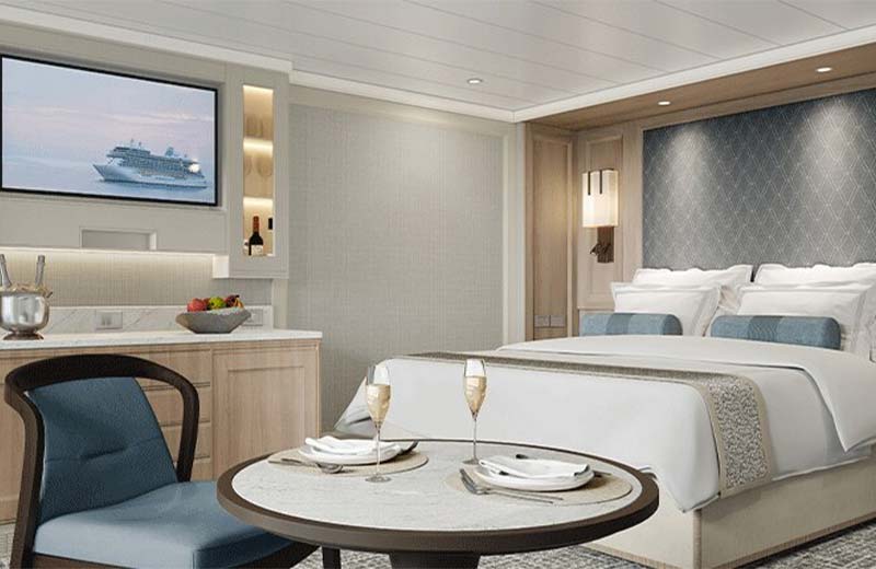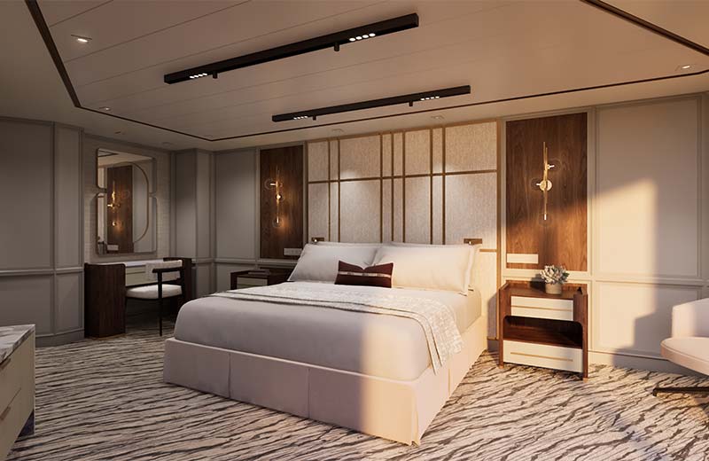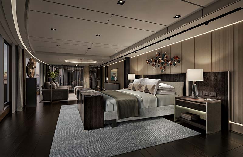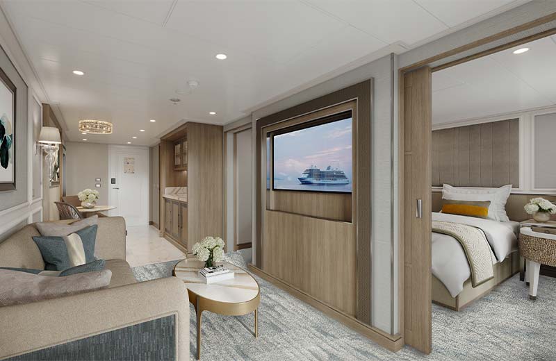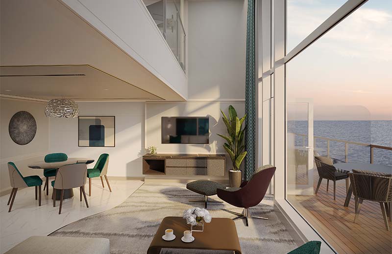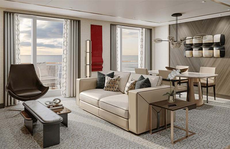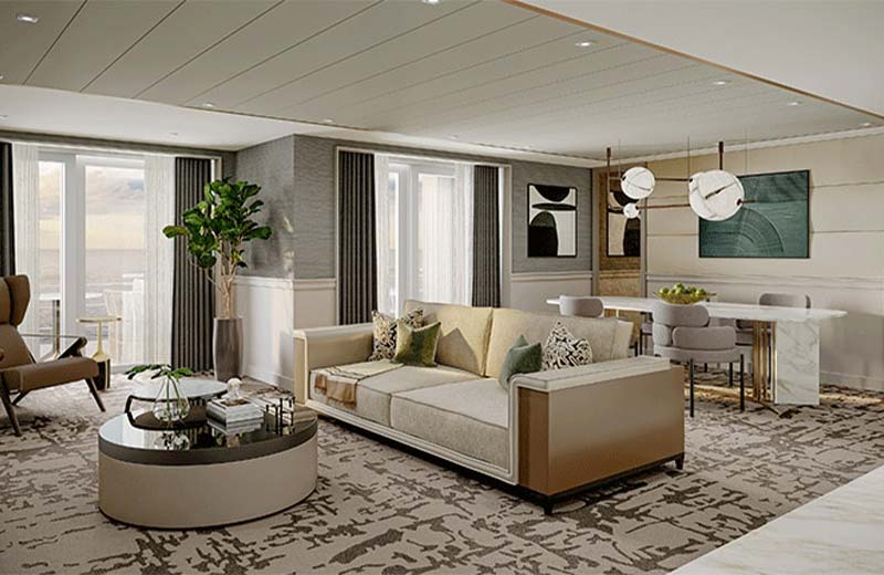 Die Skyview Regent Suite (Kategorie RS) auf der Seven Seas Prestige von Regent Seven Seas Cruises ist die größte und luxuriöseste All-inclusive-Kreuzfahrtsuite der Geschichte. Diese zweistöckige Suite, gelegen auf den Decks 14 und 15, bietet unvergleichlichen Luxus, atemberaubende Meerblicke und eine Fülle exklusiver Annehmlichkeiten. Mit einer Gesamtfläche von 817 m² (ca. 8.794 Quadratfuß) und der Kapazität für bis zu sechs Gäste definiert sie ein neues Niveau an Ultra-Luxus auf See. Die Suite kombiniert modernes italienisches Design mit exquisiter Handwerkskunst und bietet ein unvergleichliches Wohnerlebnis, das an eine luxuriöse Stadtwohnung erinnert.Ausstattungsmerkmale: