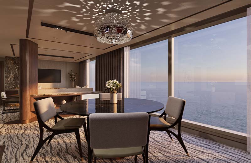 **Exklusiver Zugang zu „The Study“:** Privater Speisesaal auf Deck 11 für bis zu 12 Gäste, gelegen zwischen den Restaurants Chartreuse und Prime 7