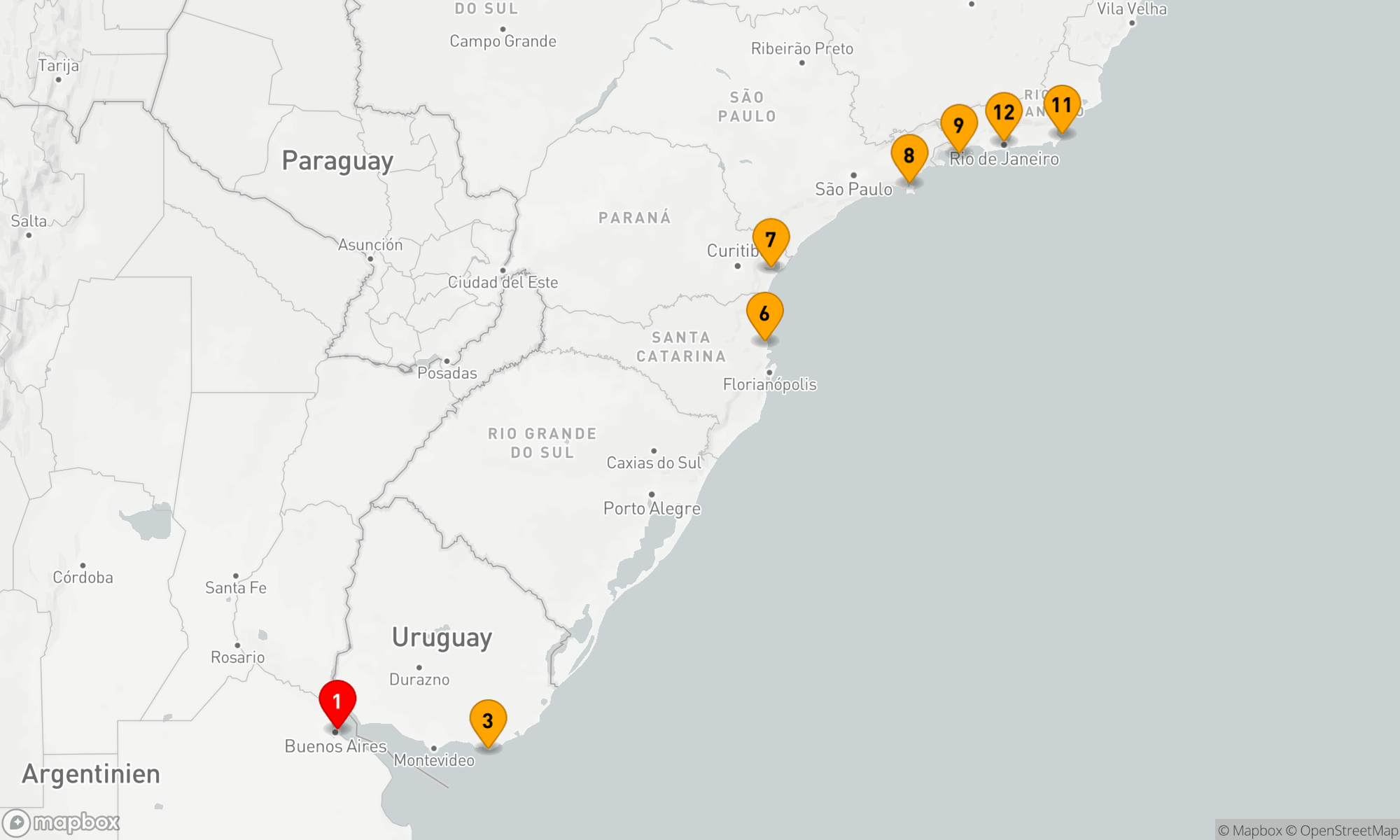 Rio de Janeiro ist die zweitgrößte Stadt Brasiliens. Wahrzeichen von Rio de Janeiro sind der Zuckerhut, die 38 Meter hohe Christusfigur auf dem Gipfel des Corcovado und die Copacabana, die als einer der schönsten Strände der Welt gilt. Die Stadt ist auch bekannt wegen des jährlich stattfindenden Karnevals von Rio. Die vielfarbige Parade der Sambaschulen gehört zu den größten Paraden der Welt.mehr zum Hafen Rio de Janeiro