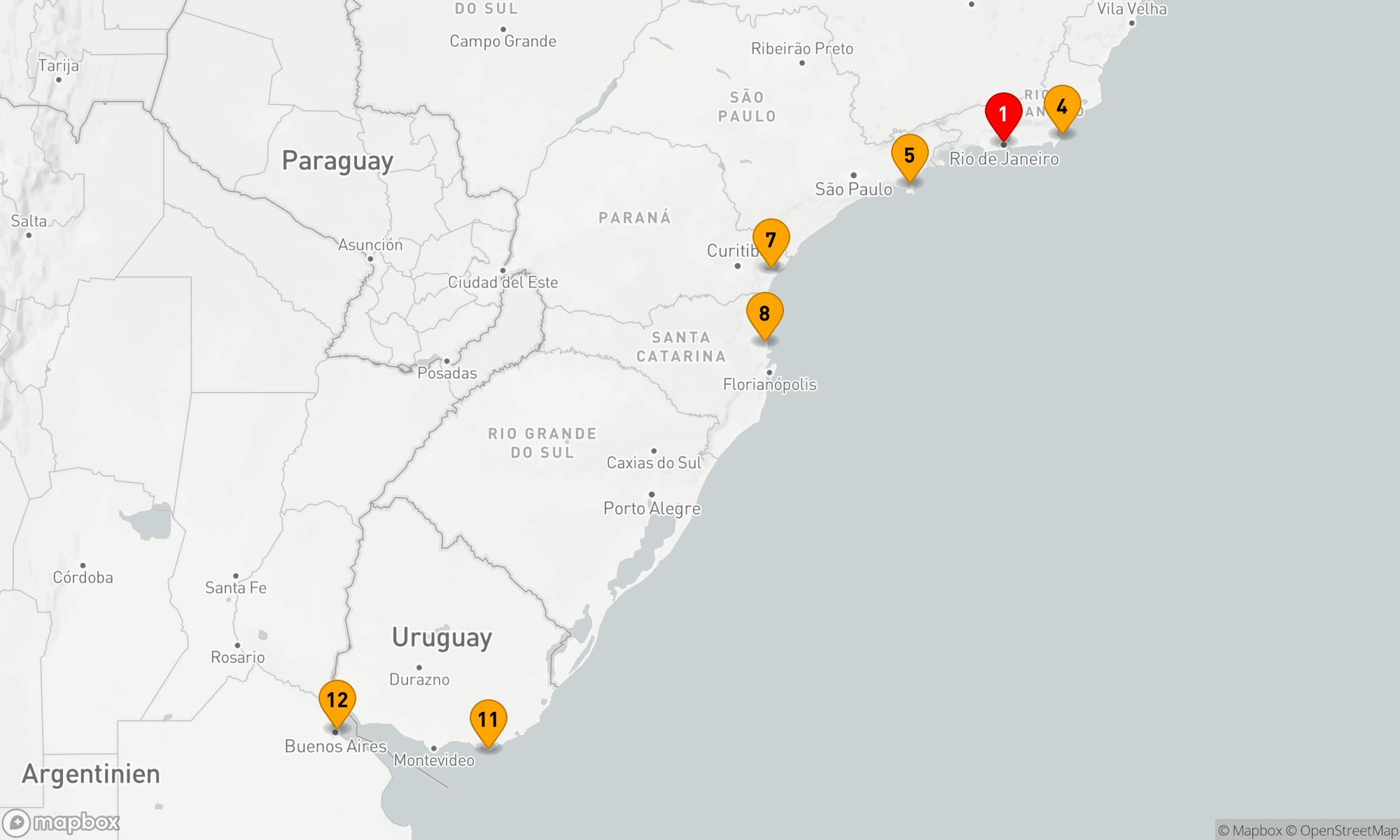 Rio de Janeiro ist die zweitgrößte Stadt Brasiliens. Wahrzeichen von Rio de Janeiro sind der Zuckerhut, die 38 Meter hohe Christusfigur auf dem Gipfel des Corcovado und die Copacabana, die als einer der schönsten Strände der Welt gilt. Die Stadt ist auch bekannt wegen des jährlich stattfindenden Karnevals von Rio. Die vielfarbige Parade der Sambaschulen gehört zu den größten Paraden der Welt.mehr zum Hafen Rio de Janeiro