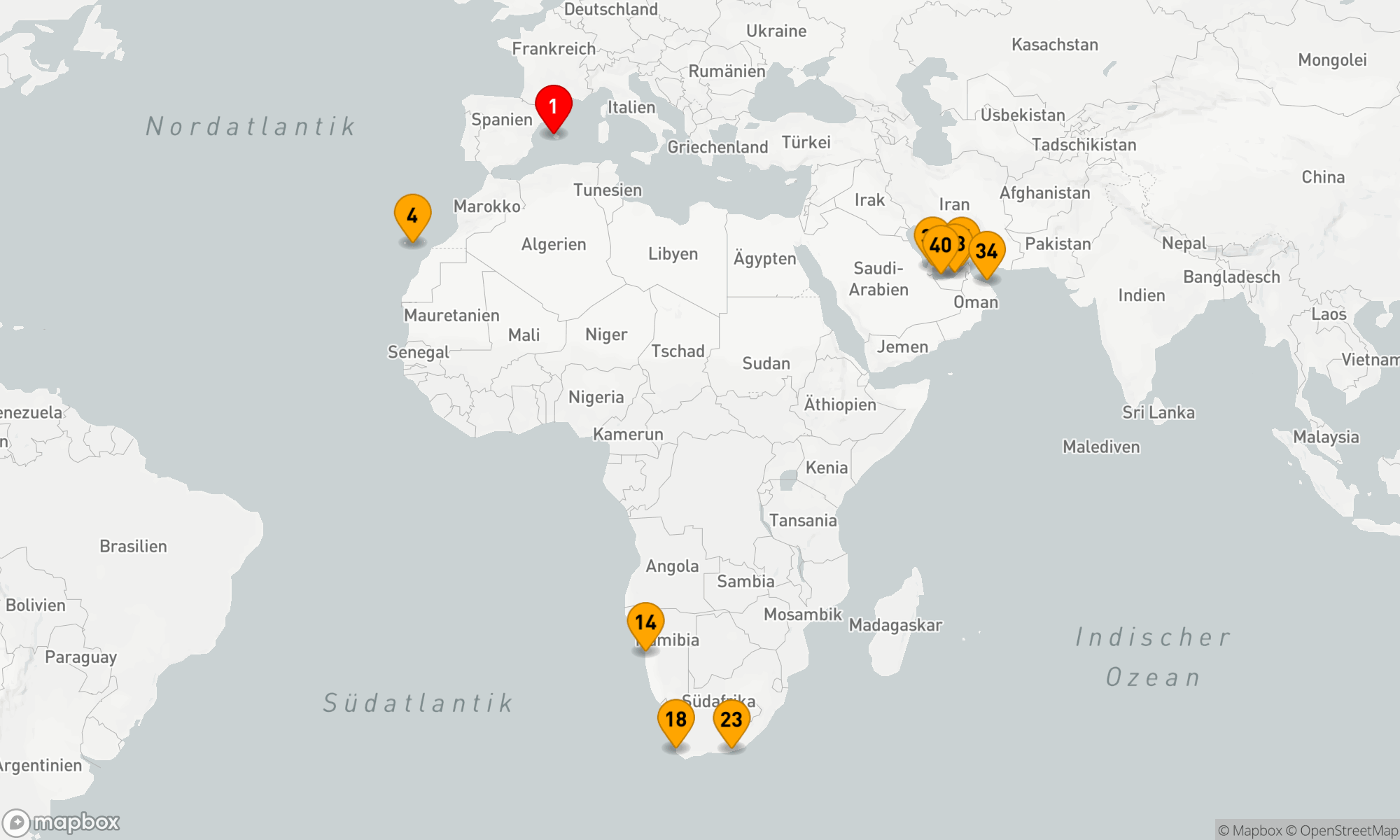 Mein Schiff Flow bereist folgende Länder: Frankreich Italien Katar Marokko Namibia Oman Portugal Spanien Südafrika V. Arabische Emirate